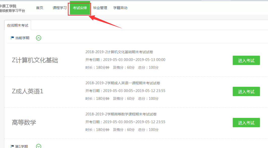 ? ? 中原工學(xué)院成人高等教育17、18、19級(jí)學(xué)生,網(wǎng)上考試課程已經(jīng)開通,這三屆學(xué)生都可以登錄網(wǎng)上學(xué)習(xí)平臺(tái)——青書學(xué)堂,進(jìn)行網(wǎng)上課程考試。因網(wǎng)考時(shí)間比較短,是在2019年5月3日-2019年5月12、13日。請(qǐng)學(xué)生在工作之余,抽出時(shí)間參加網(wǎng)考。具體網(wǎng)考位置如下圖: