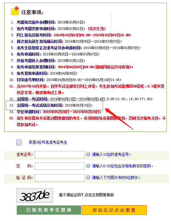 ? ? 根據(jù)省招辦政策公布,今年4 月河南自考成績查詢時間為5 月 15 日,屆時考生可登陸“河南省招生辦公室”查詢本次考試成績。查詢網(wǎng)址請登錄:http://zkwb.heao.gov.cn/zkservice/default.aspx進入以下頁面,輸入準考證號、密碼、驗證碼點擊“已報名老考生登錄”進入。