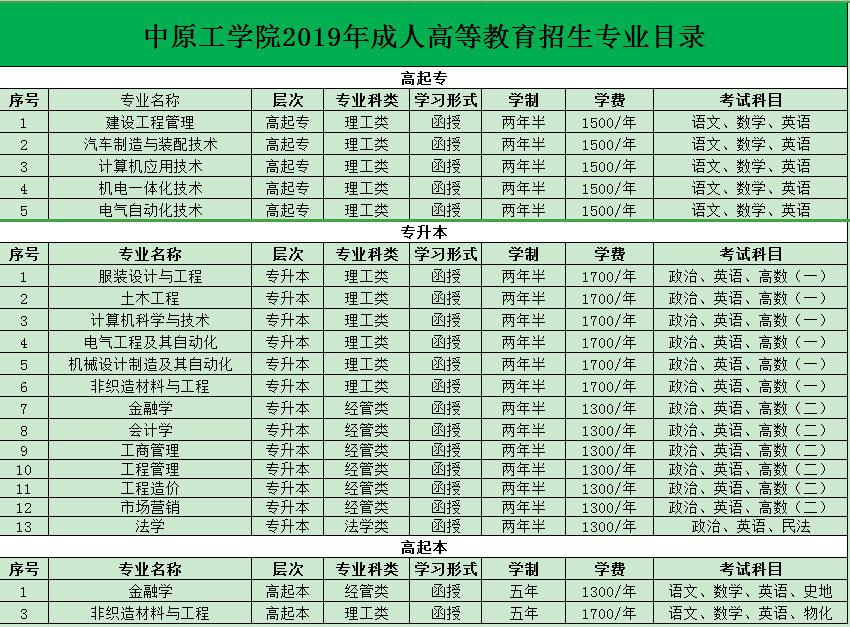 注:2019年中原工學院專升本層次取消了8個專業(yè),同時新增非織造材料與工程、服裝設(shè)計與工程等專業(yè),并且還新增高起本2個專業(yè);